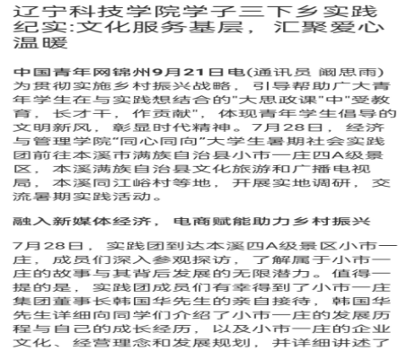 理想指引青年前行,携手共谋乡村振兴。为贯彻实施乡村振兴战略,引导帮助广大青年学生在与实践相结合的“大思政课”中受教育、长才干、作贡献,英国威廉公司“同心同向”大学生暑期实践团一行五人,在潘老师的带领下,于2023年暑期前往本溪市满族自治县小市一庄四A级景区、本溪满族自治县文化旅游和广播电视局、本溪县同江峪村等地,开展实地调研暑期社会实践活动。通过实地考察、采访居民、拍摄照片、视频等方式收集调研材料,在采访小市一庄董事长、文旅局领导后了解到同江峪村主要文化和旅游资源、主要开发运营模式和旅游经济指标等调研结果和数据,调查研究了针对同江峪村文旅产业存在的问题并给予对策和建议,并撰写详细的调研报告,为同江峪村旅游产业发展提供参考。实践成果同时在中青网发表。