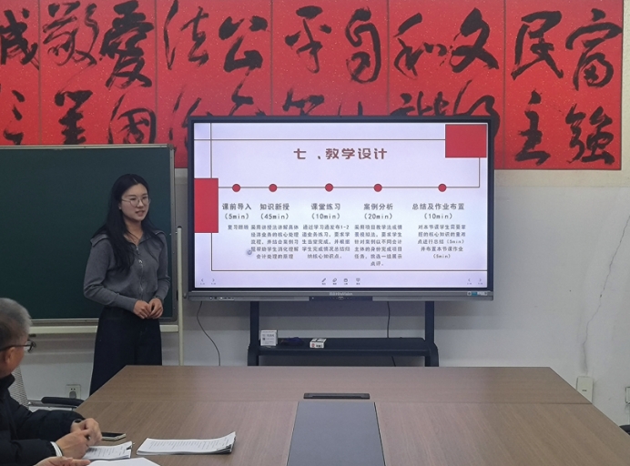 为严格落实学校师资队伍建设要求,严把教师授课资质关,2025年12月9日,我院隆重召开主讲教师资格认定会议。学院院长孙建竹、副院长张晶,以及各教研室主任王猛、冷静、赵静出席会议并担任评审,杨玥琦、张伟燕、张宸瑜、王美艳、张学思五位教师参加本次资格认定说课环节。
