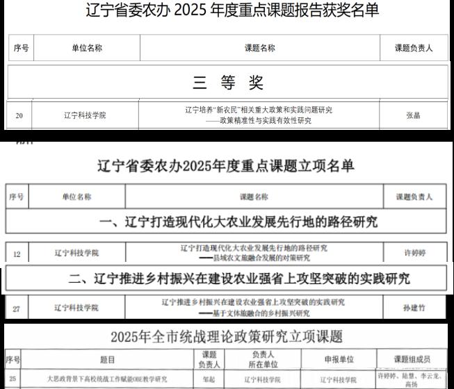 在这两项评选活动中,张晶主持的《政策精准性与实践有效性研究》荣获辽宁省委农办2025年度重点课题三等奖;孙建竹主持的《基于文体旅融合的乡村振兴研究》与许婷婷主持的《县域农文旅融合发展的对策研究》荣获优秀奖;邹起主持的《大思政背景下高校统战工作赋能OBE教学研究》荣获2025年本溪市统战理论政策研究课题优秀奖。这四项课题聚焦当下社会发展的关键领域,紧密结合地方实际需求开展研究。分别从政策精准发力助力解决农业生产实际问题、文体旅融合推动乡村振兴、县域农文旅融合发展策略以及高校统战工作与教学创新融合等不同角度,深入剖析问题并提出切实可行的解决方案。这些课题成果不仅具有较高的学术价值,更为地方政府决策提供了重要的参考依据,为地方经济社会发展注入了新的活力与智慧。