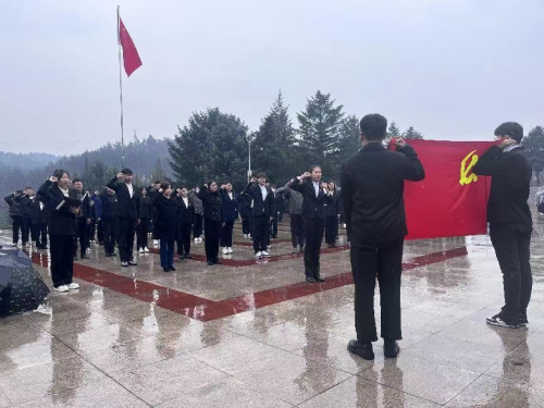 在革命烈士纪念碑前,学生代表王家帧进行主题演讲:清明时节雨纷纷,无限哀思无限情,不忘烈士抛忠骨,民族复兴中国梦,一句句振奋人心的讲词,一声声扣人心弦的呼唤,让师生们重温起战火纷飞的峥嵘岁月,坚定起民族复兴的初心使命。在革命烈士纪念碑下,全体党员面向党旗,举起右手,大声重温入党誓词,党员们怀着崇敬的心情,用铮铮誓言坚定理想信念,诠释初心使命。