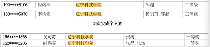 股票模拟交易个人赛:荣获省级一等奖2项、二等奖7项、三等奖3项,展现了在证券市场分析、交易策略与风险控制方面的强大实力。期货模拟交易个人赛:勇夺省级一等奖2项,体现了在衍生品交易与复杂风险管理领域的深厚功底与敏锐洞察。学术论文团队赛:荣获二等奖1项,彰显了在经济金融理论应用与学术科研创新上的高水平研究能力。