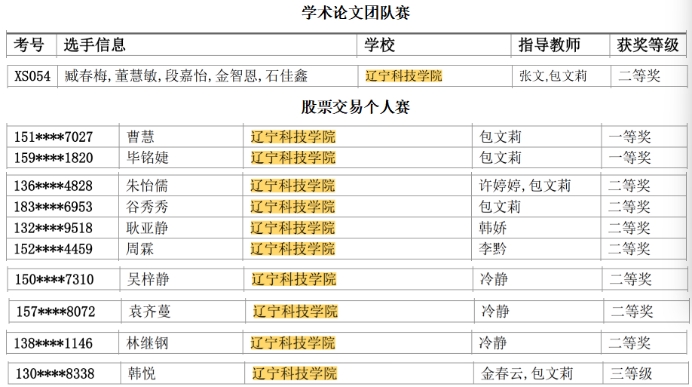 近日,第11届辽宁省智慧经济大赛圆满落幕。本届大赛吸引了全省众多高校的优秀学子同台竞技,赛事涵盖股票模拟交易个人赛、期货模拟交易个人赛以及学术论文团队赛等多个赛道,竞争激烈。我校参赛团队凭借扎实的专业知识、出色的实践能力和卓越的团队协作精神,在经过数月的精心备战与激烈角逐后,最终脱颖而出,斩获省级奖项共15项。