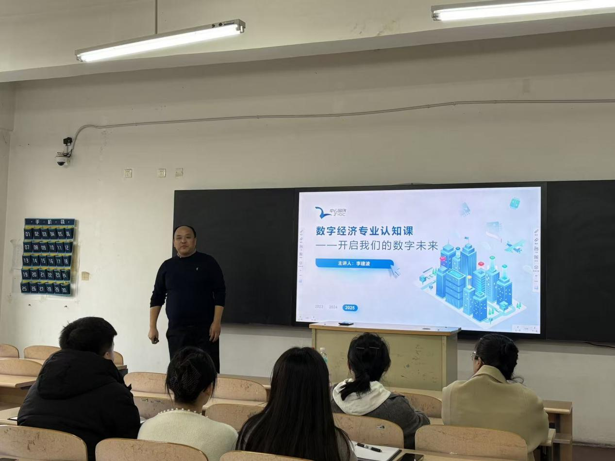 11月5日,北京中云国创数据科技有限公司数字经济事业部总经理李建波应邀来到我校,为数字经济专业全体学生带来了一场主题为“数字经济时代:从校园到职场的成长路径”的职业生涯规划与就业指导讲座,现场座无虚席,互动氛围热烈。