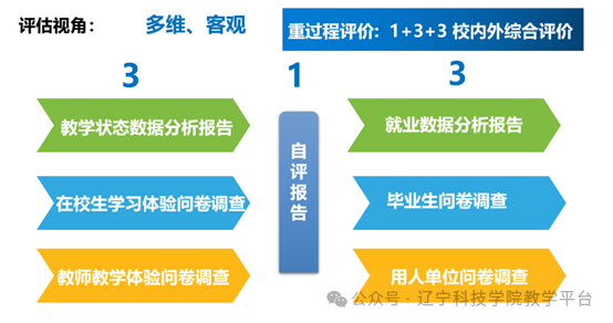 新一轮审核评估以多维立体的视角全面客观地评价学校本科教育教学质量,探索建立了以《自评报告》为主体,以《本科教学状态数据分析报告》《在校生学习体验调查报告》《教师教学体验调查报告》3份过程性报告和《本科生就业数据分析报告》《本科毕业生跟踪调查报告》《用人单位跟踪调查报告》3份结果性报告为两翼的“1+3+3”多维立体评价体系,从学校、教师、在校生、毕业生、用人单位等多元多维视角更加全面、客观、系统地呈现学校本科教育教学和人才培养情况,形成“招生-培养-就业”全链条联动的质量“闭环”评价反馈和持续改进机制,提高教育评价的科学性、专业性、客观性。真正体现“以学生为中心”的理念,引导学校促进教师投人教学,提升学生学习体验。