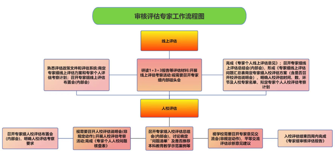 审核评估专家是受教育部评估中心或承担省级审核评估任务的单位(部门)委托,对参评学校本科教育教学工作进行评估的人员。评估专家的主要任务是依据《普通高等学校本科教育教学审核评估实施方案(2021-2025年)》要求,对参评学校的本科教育教学工作进行全面考察,帮助学校查找存在的主要问题,分析产生问题的原因,提出进一步整改的意见与建议。