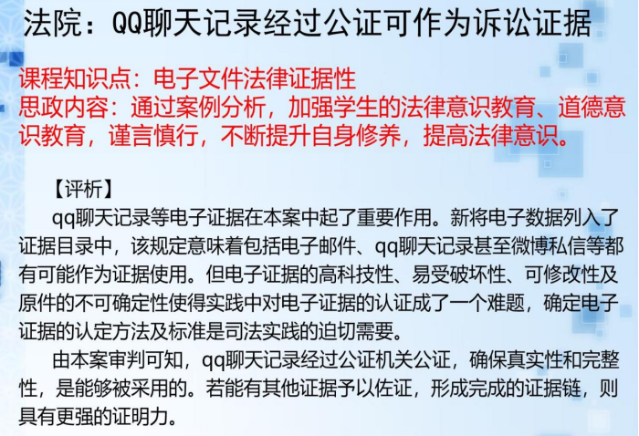 结合案例中的QQ聊天记录,分析电子文件具有证明力的基本条件,学生设计并实施保障电子文件证明力的技术措施和管理流程。讨论在网络空间中的言行如何受到法律约束。强调在网络活动中,应保持谨慎态度,避免发表不当言论或泄露敏感信息,以免引发法律纠纷。