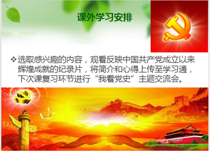 课上:讲授中国共产党成立以来的重要会议、重大事件、重要人物、取得的辉煌成就。 布置课外学习任务——自行选择观看感兴趣的反映党史的记录片,在学习通平台主题讨论区,上传视频内容梗概并谈感受。在下次课的复习环节开展“我看党支”主题讨论会。 |
