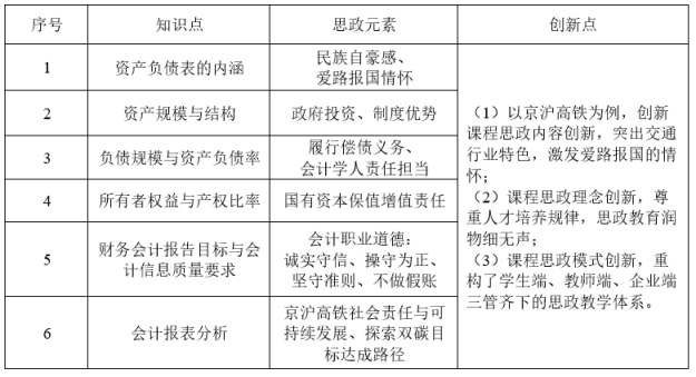 通过近十多年京沪高铁的开通与迅速发展,给沿线地区特别是长三角经济带和京津冀经济圈带来了经济发展潜力和无限商机,既开阔学生的视野,也引导学生关注我国交通强国战略,体会集中力量办大事的制度优势,增强制度自信。通过京沪高铁的资金结构分析,特别是债务比率分析,引导学生关注京沪高铁潜在的财务风险,增强学生的责任和担当意识。通过学习会计报表的披露过程,培养学生会计报表的编制能力,同时引导学生理解保证会计信息披露质量的系列原则,特别是可靠性原则,培养学生遵守会计法规和会计准则,提升会计职业道德和职业素养。通过学习京沪高铁的财务分析方法,提升学生对企业财务分析能力,引导学生适应目前智能化对会计职业的挑战,引导学生合理规划职业定位,提升专业胜任能力。培养学生的爱路报国的精神和诚信为本的职业道德,增加制度自信,为后续的学习工作打下坚实基础。