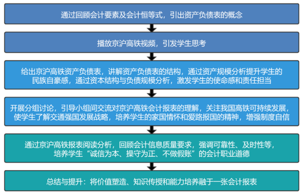 第八,总结与提升:通过京沪高铁的资产负债表解读,学生既掌握了资产负债表的解读方法,也增强了学生的制度自信,培养学生的爱路报国的精神和诚信为本的职业道德,为后续的学习工作打下坚实基础。
