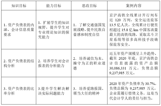 (一)案例名称:第十章报表系统第二节“资产负债表编制与分析”中“分析京沪高铁报表 激发爱路报国情怀”案例运用在的课程思政案例