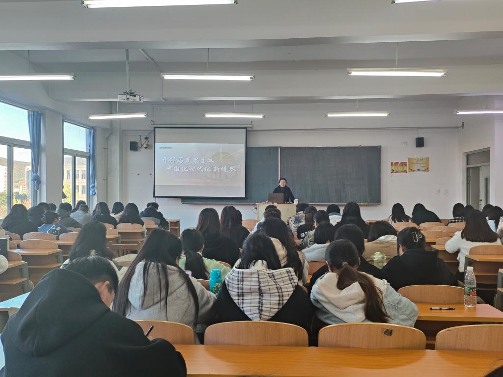 张建华书记则从内涵博大精深、彰显实践伟力、绽放真理光芒三个层面,为同学们深刻剖析、详细解读了习近平新时代中国特色社会主义思想创立的时代背景、科学内涵、实践伟力,以及贯穿这一思想的立场观点方法。她强调,同学们要从历史逻辑、理论逻辑和实际逻辑相统一的高度,整体把握这一思想的科学体系,感悟思想伟力,汲取思想力量,争当新思想坚定的信仰者、忠实的实践者。新征程是充满光荣与梦想的远征,对于每一个人特别是广大青年来说,它既是一个更广阔的舞台,也是必须担当的时代使命。她勉励同学们,有责任有担当,青春才会闪光,应自觉听从党和人民的召唤,把个人理想追求融入到实现中华民族伟大复兴的奋斗历程,厚植家国情怀、涵养进取品格,在青春的赛道上奋力奔跑,争取跑出当代青年的最好成绩!