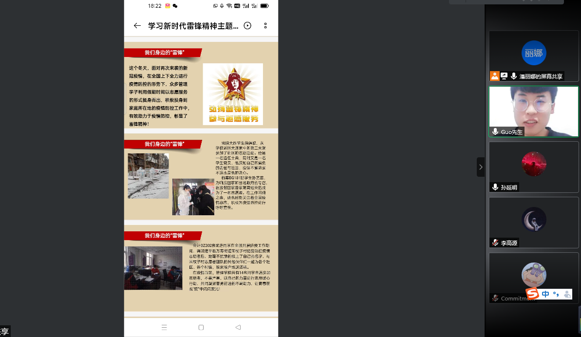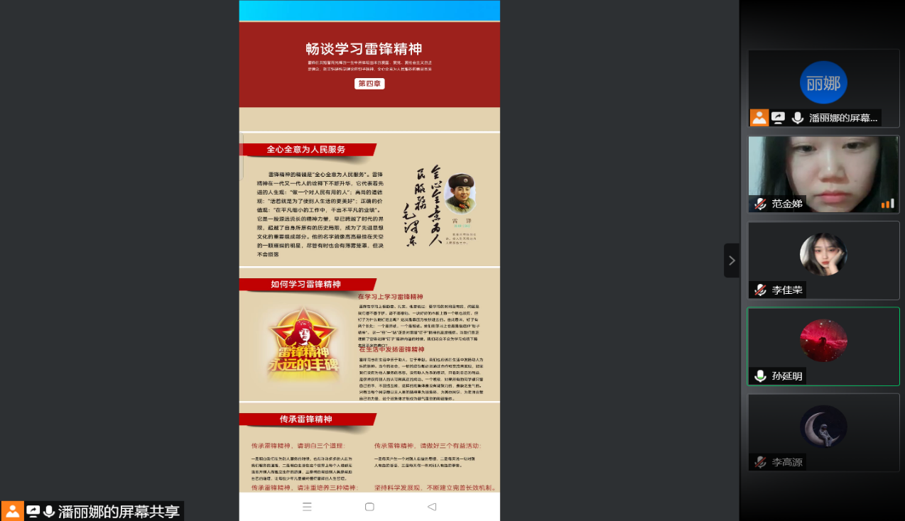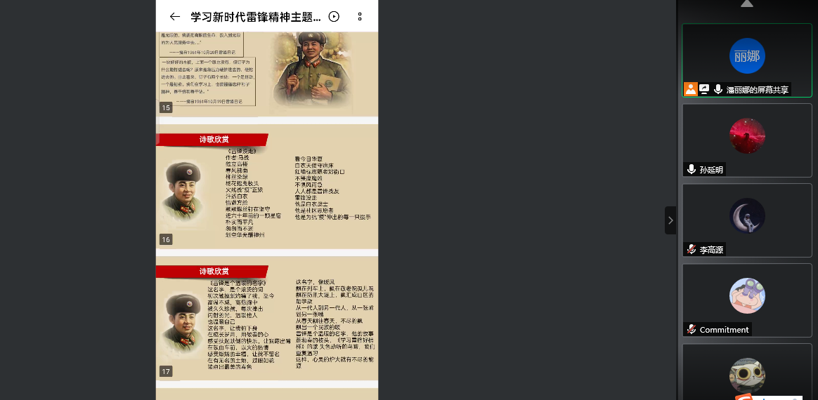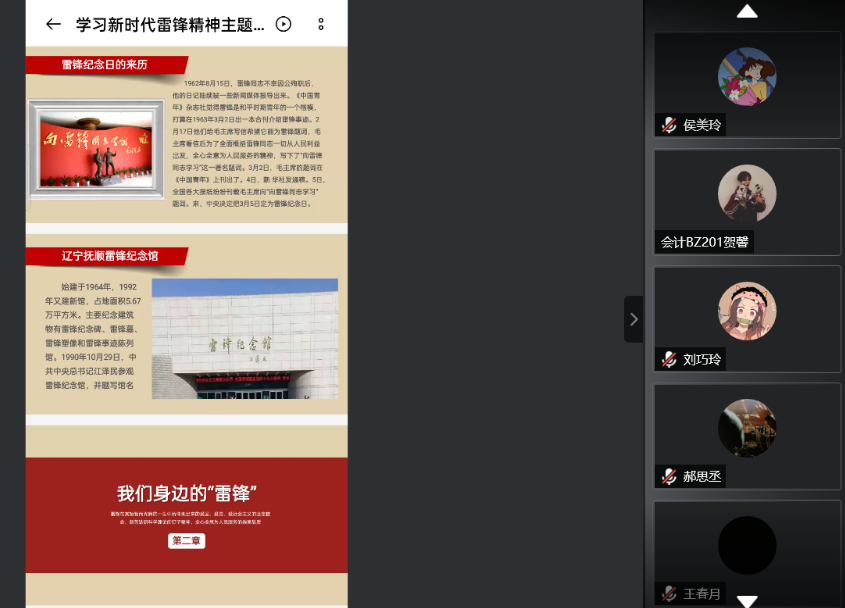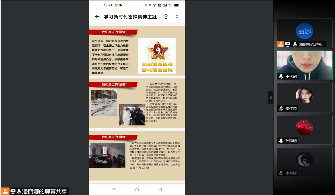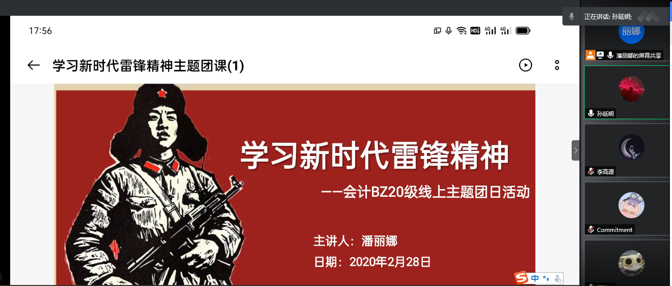 此次主题团日活动通过腾讯会议的方式在管理学院会计BZ20团支部召开,首先辅导员潘老师通过PPT的形式为同学们讲解了雷锋同志生平事迹、我们身边的“雷锋”等先进事迹,从不同角度对新时代雷锋精神进行阐述,带领同学们重温雷锋同志身上所体现出的钉子精神、爱岗敬业精神、艰苦奋斗精神、勤俭节约精神、锐意进取和自强不息的创新精神。