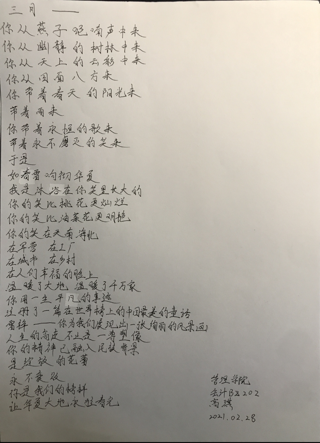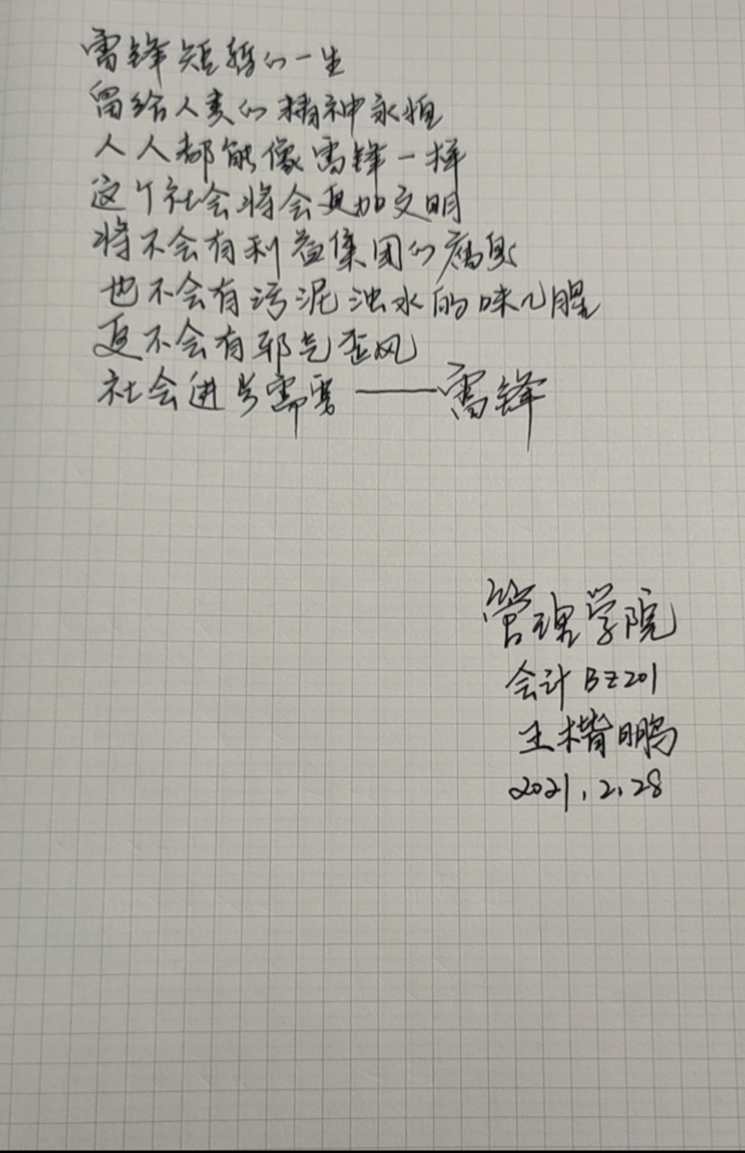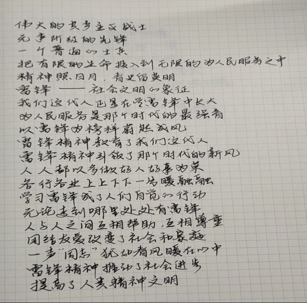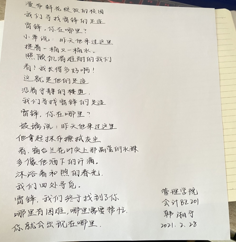在团课过程中,同学们纷纷踊跃发言,畅谈学习雷锋精神的心得。李星秀同学说到:“雷锋勇于克服困难,自觉为国分忧,勤俭节约、奋发进取,乐于奉献的精神正是我们要学习的崇高品质。”唐启航同学说:“雷锋的名字曾经是激励我们几代人成长的路标,无论我们从事什么工作。 都不能缺少雷锋精神。取得成功最重要的不是我们的能力大小,而是一个人的道德品质。任何时候雷锋身上助人为乐、爱岗敬业、积极进取、勤俭节约的品质都是我们不断学习的要素。”王秋懿同学说到:“雷锋是一个名字,更是一种精神。他的行为让我们无时无刻都在缅怀他,他的奉献更让我们无时无刻都在学习他。”孙延明同学说到:“雷锋精神的化身在我们身边无处不在,雷锋精神不是标语,亦不是口号,我们只需实实在在去学习它。只有我们自己发扬助人为乐的精神,只有我们自己学会与人为善。我们才能得到别人的帮助和尊敬,才能在互动的真诚中感到真正的快乐。希望在以后的生活中,我们要牢记雷锋精神,永远也不能缺乏雷锋身上那种对他人和世界的关坏与爱。”几位同学畅谈完后,由王楷鹏、韩湘宁、高琪和岳昕这四位同学声情并茂地朗诵了与雷锋精神相关的诗歌。活动通过这两种方式使同学们对“雷锋精神”有了新的认识。从而以实际行动弘扬雷锋精神,参与志愿服务,提高同学们的道德实践能力,形成向上向善的青春力量。