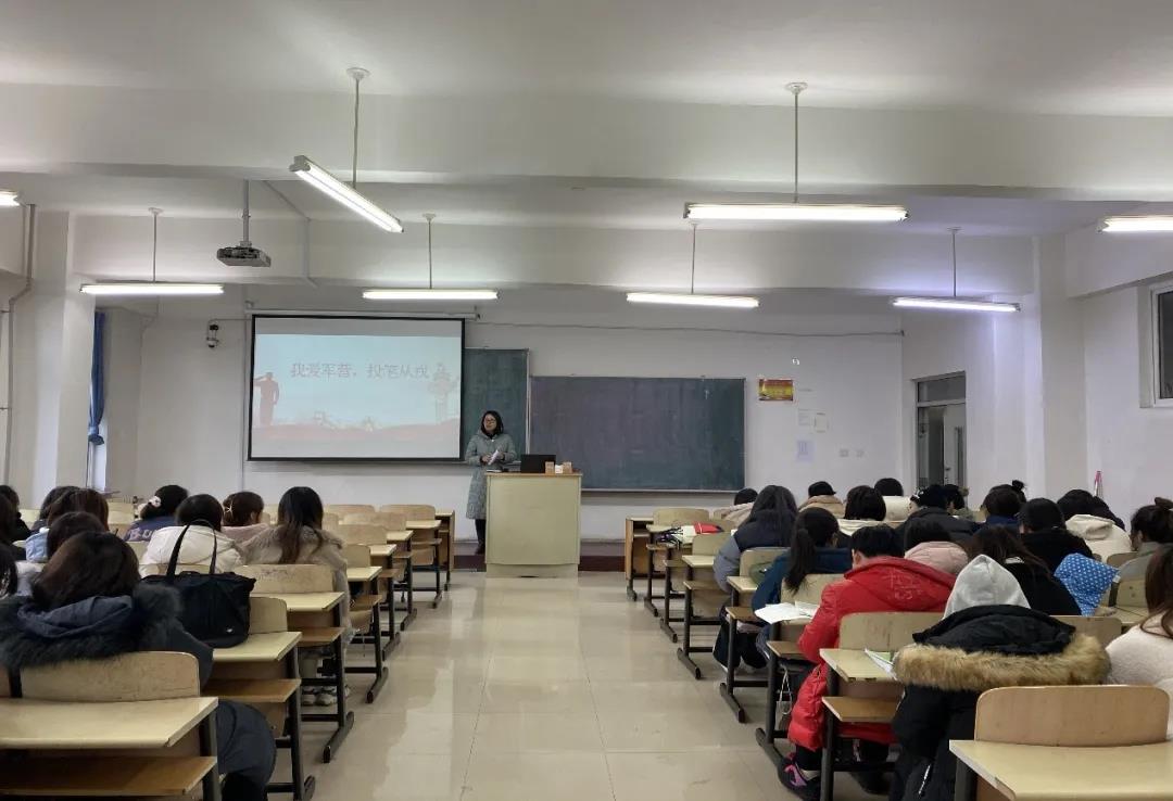 首先,学院潘老师向同学们阐述了当代大学生入伍的重要意义,关心国防事业是全社会的共同责任,作为当代大学生,我们要不辱使命,把爱国热情化为报国之心,坚定理想信念,为祖国的发展和强大贡献自己的一份力量,用自己的青春和热血为实现伟大的强军梦谱写新的篇章。