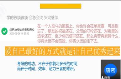 档案BG161唐密同学分享了备考过程中的心得和感悟。她以自己的切身经历向同学们讲述了宝贵的考研经验,着重强调了学习时的心境,多注重身体,要沉下心来学习。在平时养成良好的生活习惯,规范自己的生活规律,并提醒各位备考生考前模拟的重要性,不能让考试试卷成为你做的第一份完整试卷。考研的成功不在于你复习多长的时间,而在于时间、效率、耐力三者的乘积。