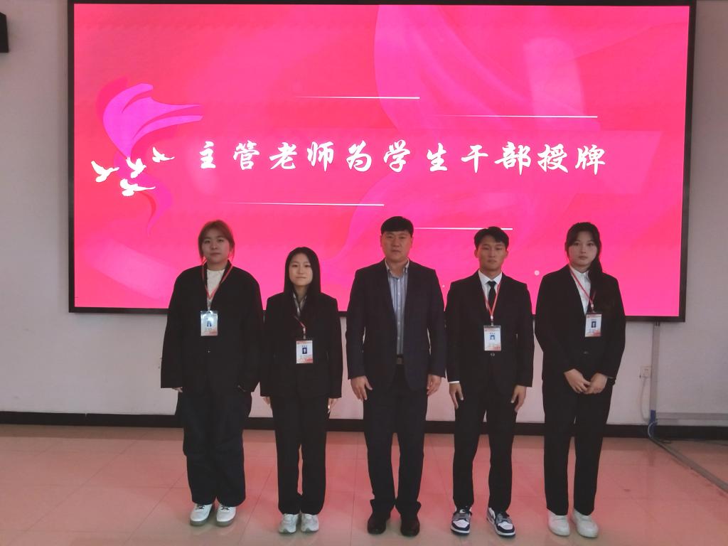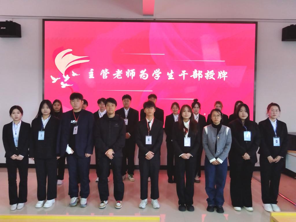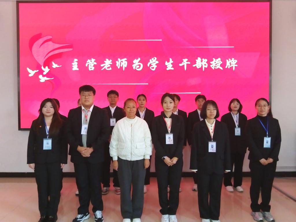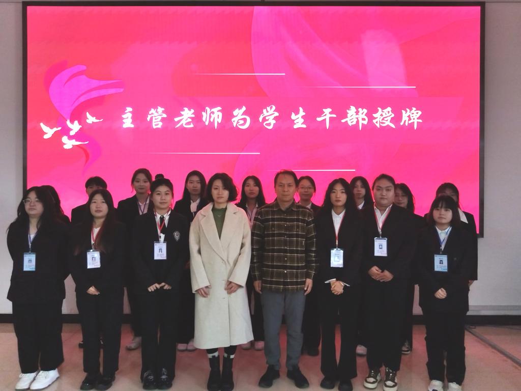 学院党总支副书记兰恭文、辅导员为当选学生会干部授牌。