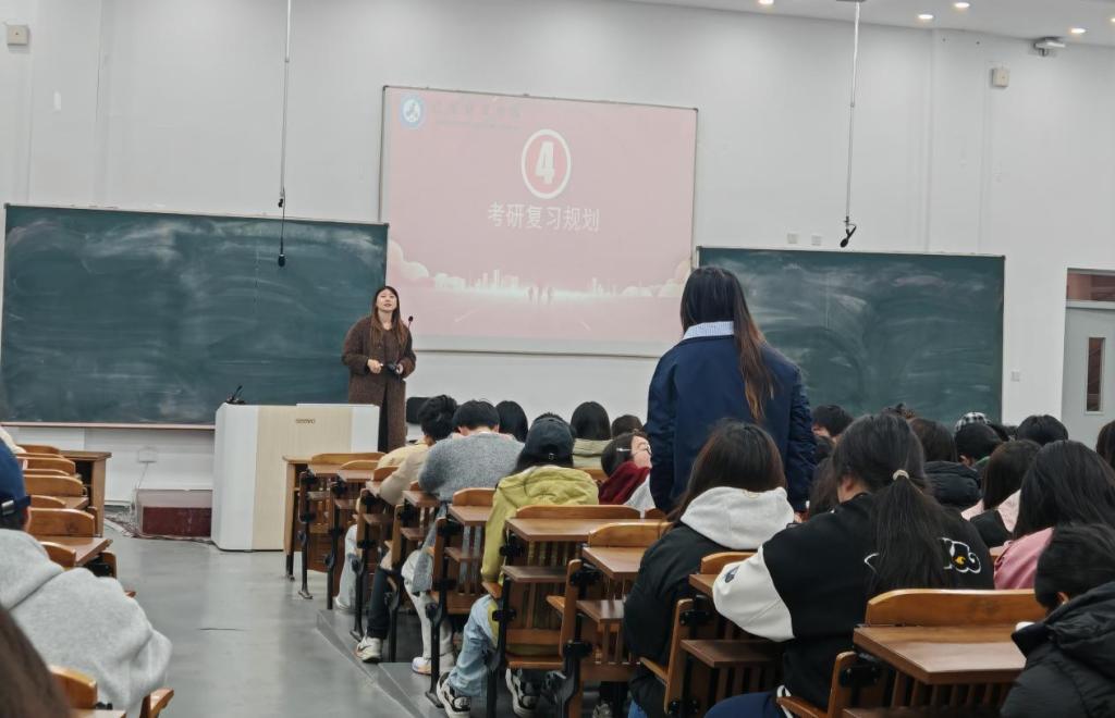 宣讲会紧扣学子需求,围绕“考研价值与福利、考研形势分析、专业与择校指导、复习策略与学霸经验”四大核心板块展开深度分享:首先米老师结合经管类行业就业趋势,从学历提升拓宽发展边界、职业发展增强核心竞争力、学术深造夯实研究基础三个维度,系统阐述考研的长期价值;同时细致讲解考研专项奖学金、调剂政策红利等实用信息,让学子直观感知考研“性价比”,坚定备考决心。其次,依托最新全国及经管类专业考研数据,米老师拆解报考规模、录取比例等关键指标,深入剖析经管类考研“竞争激烈但方向多元”的特点与趋势。她特别提醒学子,既要正视竞争压力,更要避免盲目跟风,需结合自身优势理性锁定目标,为备考筑牢方向根基。再次,米老师聚焦国内重点经管类院校的专业特色、招生偏好及复试侧重点,结合金融、会计、工商管理等热门专业的就业前景,为基础不同、职业规划各异的学子提供“个性化择校择专业方案”,帮助大家精准匹配报考方向,减少选择成本。最后,针对考研英语、政治、数学及经管类专业课的学科特性,米老师提出“基础积累(3-6月)—强化提升(7-10月)—冲刺模拟(11-12月)”的分阶段复习框架,明确各阶段核心任务与时间分配;同时分享学霸备考中的时间管理技巧、心态调节方法及高性价比资料清单,为学子提供可直接落地的备考“行动指南”。