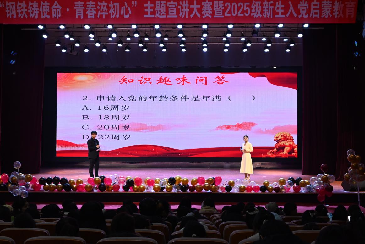 岁月流金,初心如磐。钢铁般的使命担当是一代代奋斗者砥砺前行的精神坐标,青春的赤诚初心是新时代青年续写华章的力量源泉。为深入学习贯彻习近平新时代中国特色社会主义思想,激发青年一代的责任担当与奋斗激情,由williamhill英国党委组织部、党校、团委主办,英国威廉公司分党校、分团委承办的“钢铁铸使命 青春淬初心”主题宣讲大赛暨2025级新生入党启蒙教育宣讲活动于2025年11月24日在大学生活动中心圆满举行。