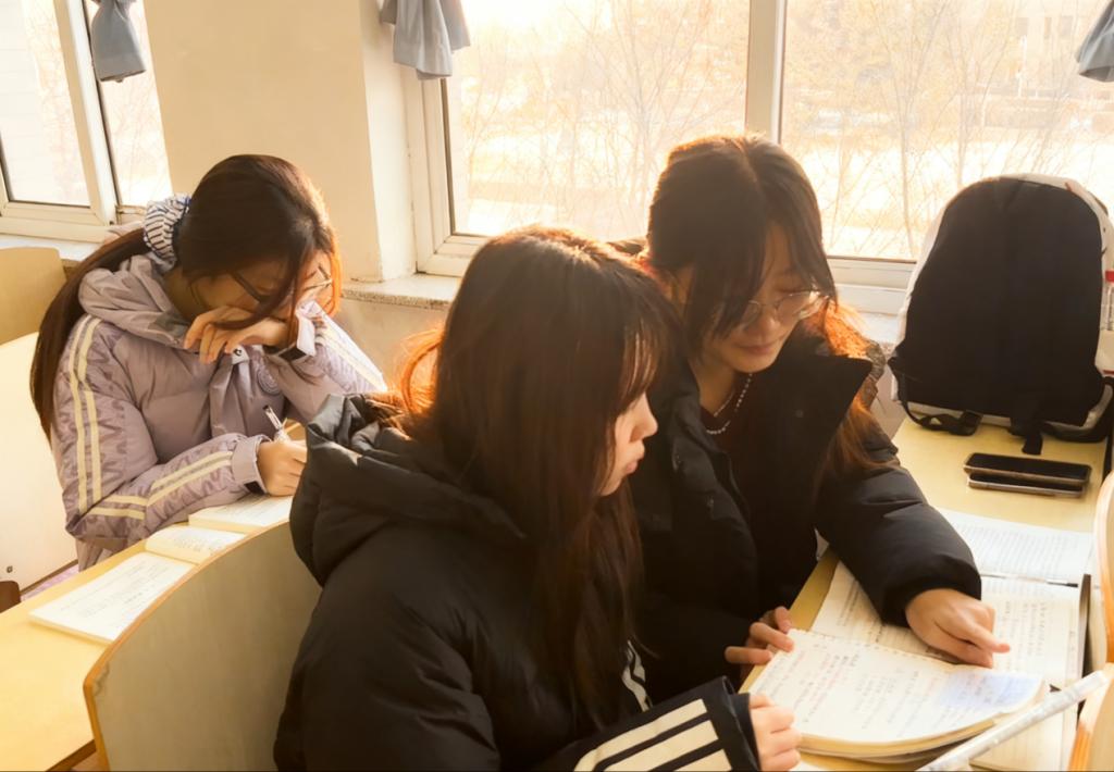 在众多参赛作品中,一组名为《窗畔谈影》的照片格外引人注目。画面中,阳光透过教室窗户洒在课桌上,两名同学正在轻声交流,似在讲解难题,神情专注。后面一名同学正低头演算,眉头微蹙却目光坚定。照片的光影对比细腻,将学子钻研难题的执着神态展现得淋漓尽致。